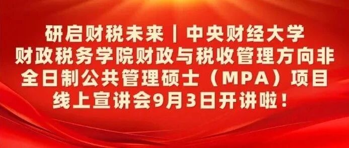 在财税改革的时代潮流中,你是否渴望把握趋势、引领创新?中央财经大学财政税务学院财政与税收管理方向非全日制公共管理硕士(MPA)项目线上宣讲会,将为你开启“研”途新篇章,助力你实现跨越式成长。中央财经大学携手中国税务学会与国家税务总局税务干部学院三方共建,依托国家级税收智库、高校一流学术资源及专业实践平台,创新打造财税领域高端人才培养新模式,构筑服务国家财税治理现代化的战略高地,推出财政与税收管理方...[详细]