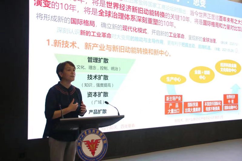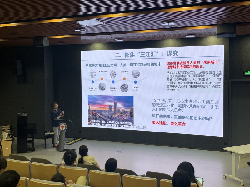 张勤副局长在第二部分“聚焦‘三江汇’:谋变”中对未来城市作了科学全面的讲解,让同学们对未来城市有了更加丰富的想象。她表示,三江汇是跨江到拥江发展的转合枢纽,是都市向田园转换的多元体验,有历史与现代交融的多重魅力,是创新与创意无限的孕育沃土,为未来建设提供了想象和雕琢的场景。同时,她强调城市文明最核心的基因是安全、繁荣、宜居,未来城市演化升级的方向是永续魅力,是“人+城市+自然+文化”和谐共生。